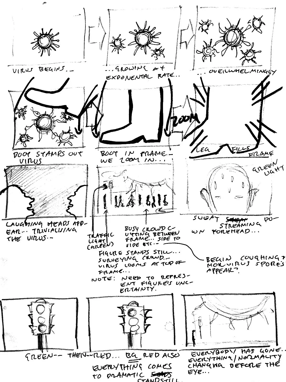 Joe and Bella’s commission initiated with a period of research into individual experiences of the UK lockdown period from March to July 2020. A series of questions were formulated to gain a broad picture of emotional, practical and political responses to the pandemic. Some interviews were undertaken in socially distanced garden meetings and others by email. Written, verbal and pictorial responses were collated via a shared digital platform. Creative exploration of the research differed between the two artists. Bella accessed the research material by making lists of dreams, objects and feelings that interested her and used themes from photographs and sketches that interviewees had supplied in response to questions relating to hopes and fears, dreams and key moments of realisation. Bella selected from these lists at random, drawing on Surrealist principles. Joe used illustration as a way in, visualising ideas and experiences through sketching which were then refined into storyboarding thumbnails, stills and animations. Both artists found an anchor in one personal testimony that described feelings of anxiety and abruptness when the reality of restrictions had registered for the first time. The resulting work, Covid Cinema, is a fascinating piece of work that captures the trauma, mundanity and introspection central to life in lockdown. The animation fuses analogue and digital processes and aptly explores the human mind through a medley of imagery that lilts between the representational and the abstract. The result is a striking articulation of our collective human experience.